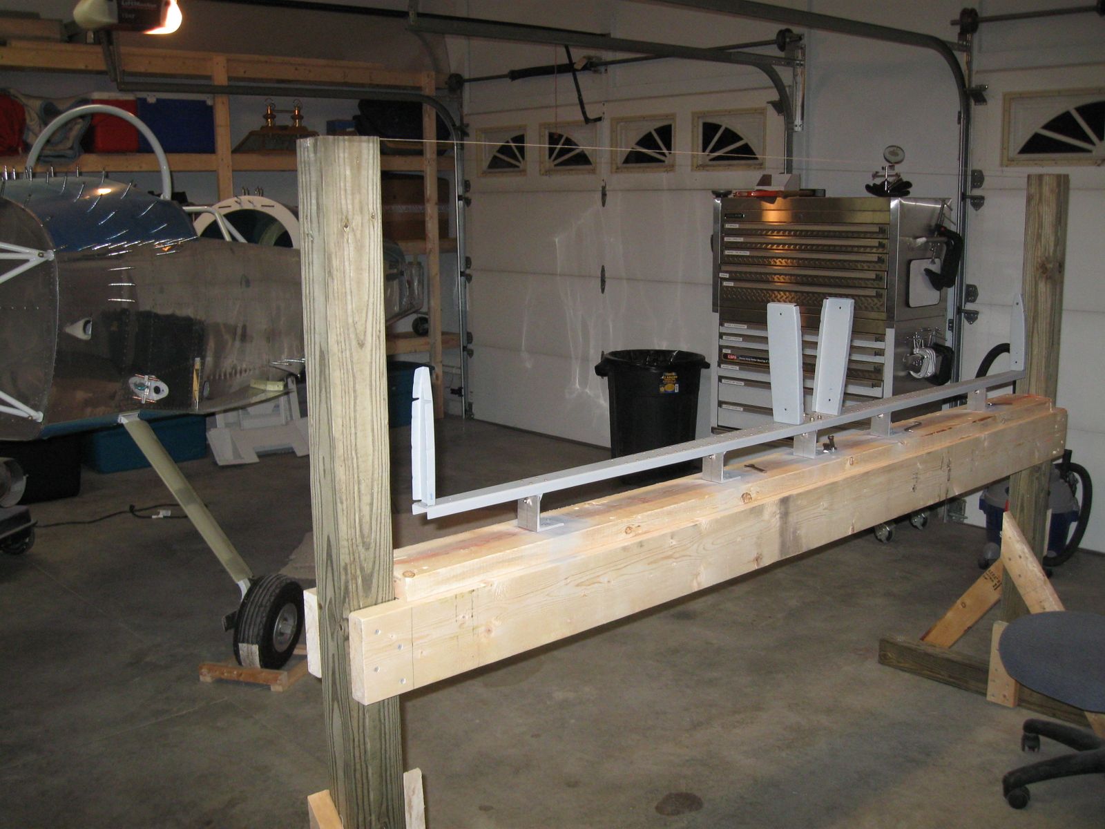 | Tail jig. Anchored to floor with concrete anchors and level in all dimensions (or at least as level as organic wood can be). HS structure bolted to the jig using several brackets made from aluminum angle. |